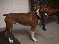 OLD, FAWN AND WHITE, ABOUT 50 LBS, HAS A DOCKED TAIL, EXPRESSIVE CROPPED